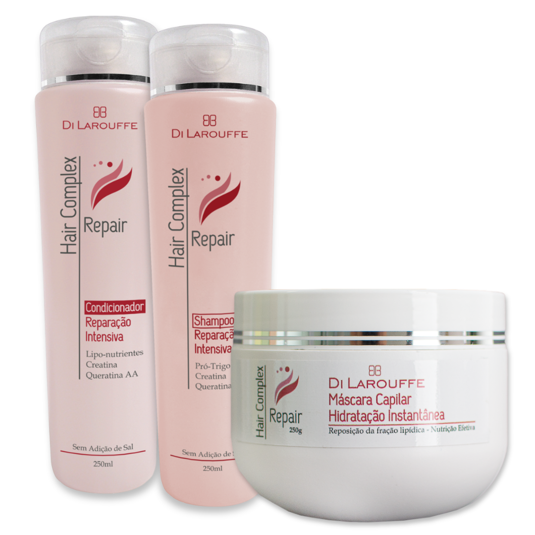 Este Kit contém os 3 produtos.Shampoo Reparação Intensiva, Condicionador Reparação Intensiva e Máscara Capilar Hidratação instantânea.